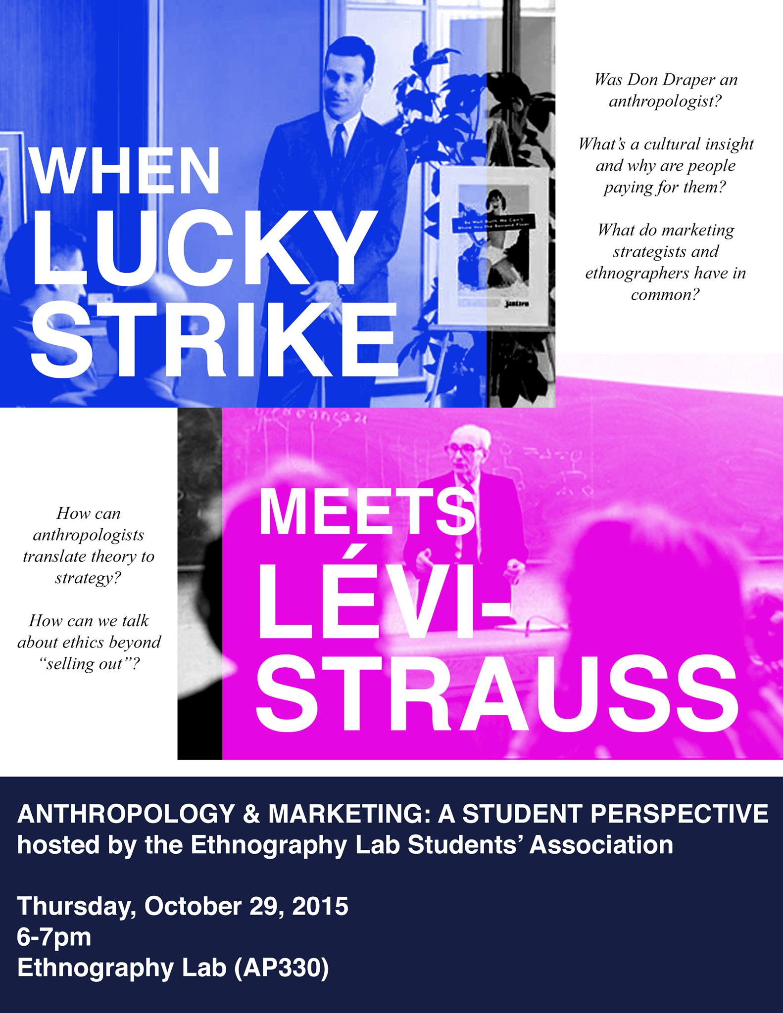 A follow-up to the Ethnography Lab’s “Ethnography in the Private Sector” talk by Graham Candy, anthropology students who interned at Diamond Integrated Marketing this past summer will be talking about what it’s like translating theory learned in the classroom to strategy presented in the boardroom.