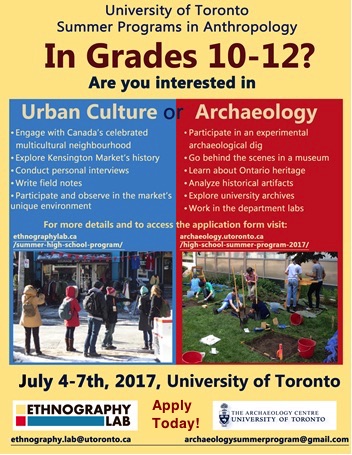 The Ethnography Lab in the Department of Anthropology at the University of Toronto will be running a week-long anthropology program for high-school students interested in culture, social change, and history. Students from local high-schools will have a chance to explore Kensington Market’s history as one of Canada’s most celebrated multicultural neighborhoods. As they learn about the market and its place in Toronto’s changing social landscape, students will be introduced to interview techniques, archival research, field-note writing, and participant-observation.The program will be run by senior anthropology undergraduate and graduate students. Participants in grade 10, 11, and 12 are welcome to apply for this exciting intensive program, which will run from July 4-7th 2017. This program is supported by the Archeology Centre at the University of Toronto. Space in this course will be limited to 12 students. Materials will be provided.