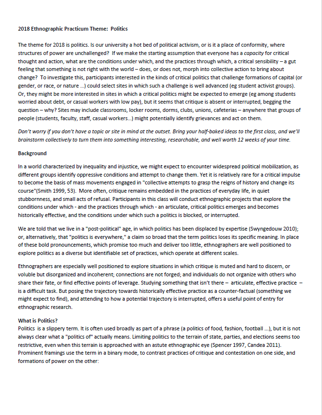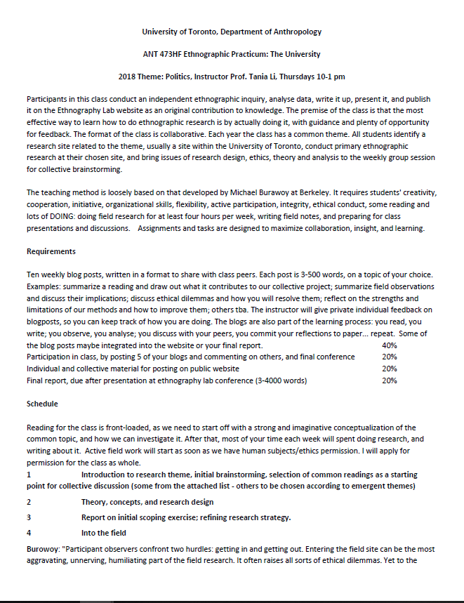 Syllabus (Ethnography of the University 2018: Focus on Politics) Posted on January 4, 2019 by Carsten Knoch Leave a comment ANT473 Syllabus PDF Share this: Click to print (Opens in new window) Print Click to email a link to a friend (Opens in new window) Email Related