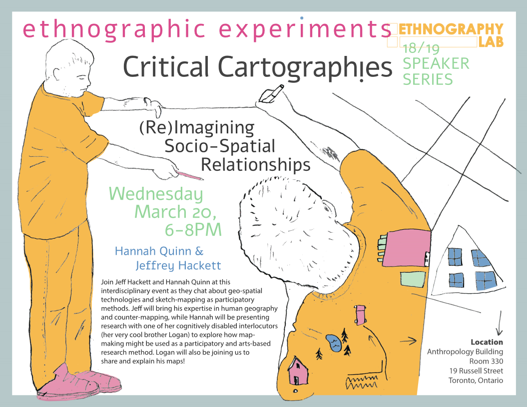 Join Jeff and Hannah at this interdisciplinary event as they chat about geospatial technologies and sketch-mapping as participatory methods. Jeff will bring his background and expertise in human geography and counter-mapping, while Hannah will be presenting some preliminary findings from her pilot research conducted between June and August 2018. Drawing on insights from counter-mapping, Hannah worked with one of her cognitively disabled interlocutors (her very cool brother Logan) to explore how map-making might be used as a participatory and arts-based research method. Logan will also be joining us to share and explain his maps!