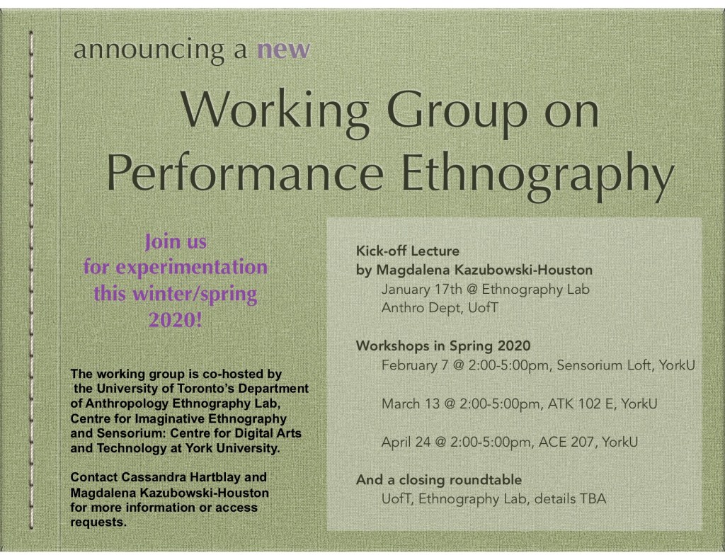 Please join us for the first workshop of the Performance Ethnography Working Group, a joint initiative of the Centre for Imaginative Ethnography at York University and the Ethnography Lab at the University of Toronto. The workshop will take place this Friday, February 7th from 2-5pm.