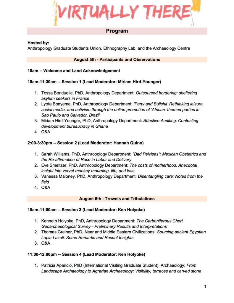 On August 5th and 6th 2020, graduate students from the department of anthropology at the University of Toronto will be presenting research papers and works-in-progress to their peers and faculty. You are warmly invited to attend, watch the presentations, and engage with comments and questions. The event is presented by the Anthropology Graduate Student Union (AGSU), Ethnography Lab, and Archaeology Centre.