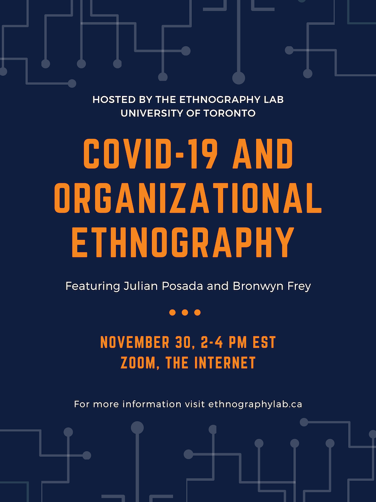 **Please join the Ethnography Lab for “COVID 19 and Organizational Ethnography” on Nov. 30 from 2-4 pm. Event Description and Registration info below.