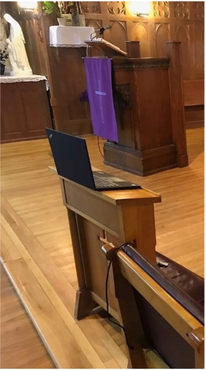 For those who did attend the physical church once re-opened, seeing the exposed technological devices was bizarre. The presence of the devices disrupted the aesthetics of the church. Technology was usually hidden from Fr. K’s gaze since he requires all cells to be turned off in the church as a sign of respect and to limit distractions. He encourages parishioners to “disconnect” from the outside world during Mass and focus on their faith. So, I could not help myself from smirking underneath my mask when positioned in front of the altar was the laptop (used to record Mass) propped on top of the wooden confessional kneeler. The laptop on the kneeler captures technology’s newfound role in this parish and the change in narrative from a device that distracts to one that helps spread the faith.