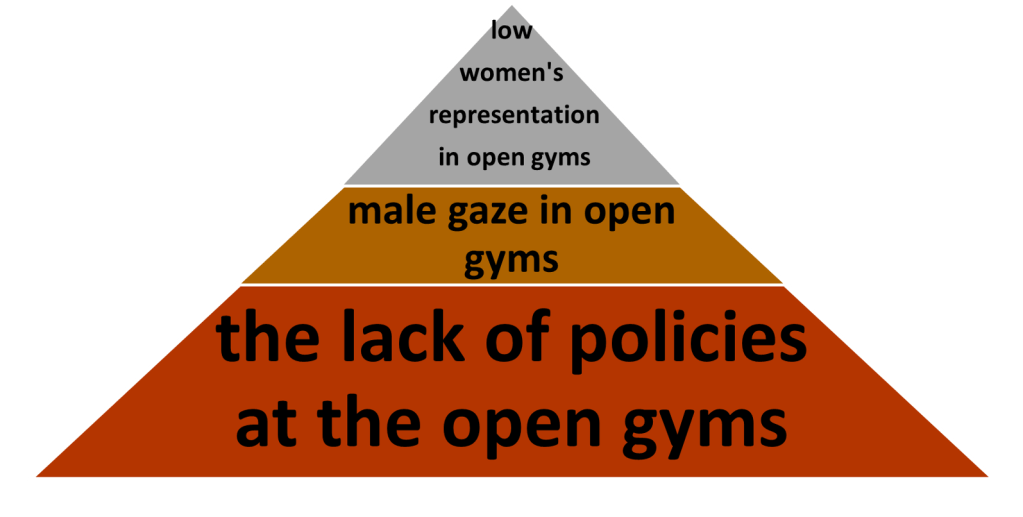 In an interview with one of the members of the administrative apparatus at the Athletic Center, Matthew (pseudonym), I asked: “So, do you think that so-called male gaze exists at open gyms?” Matthew shook his head and took a couple of seconds to choose the right words. “You know, at gyms, we are a micro-society. People do not stop being people” said Matthew, shrugging his shoulders. That phrase became key to my understanding of the depressive and uncomfortable atmosphere and the differential power relations between genders in gym spaces. The “micro-society” that the gyms re-produce implies that all existing social issues, including the male gaze, freely exist and thrive in sports facilities.