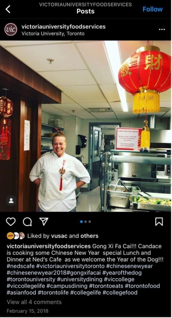This is best exemplified by the themed nights in dining halls, including Chinese New Year or Diwali. On Victoria University Food Services Instagram, a post from 2018 advertised a “Chinese New Year special lunch and dinner” consisting of Mandarin ginger chicken or tofu with stir fried veggies and steamed rice.14 In the picture, a white female chef is wearing a “Chinese” costume comprised of chopsticks in her hair and a broach with Chinese characters on it. She is smiling, standing next to the stir fry she cooked specially for this holiday. Although the sentiment is positive, this chef likely wanted to create a space for Chinese students to be included, but the way this holiday is celebrated in this setting undermines its significance. The gaudy decorations and Westernized versions of the food send a message that the occasion was created to give white students a taste of Chinese food, as opposed to truly catering for Chinese students. I would argue that special religious holiday such as the Lunar New Year or Diwali are lumped together with more trivial spectacles such as Halloween or Valentine’s Day. This slippage is evident because all of these “themed” events are signalled as “celebrations” with tacky decorations, such as the red paper lantern seen in the photo, and of course “special” food. However, the ethnic food served are often stereotypical dishes such as stir fry for Chinese New Year or butter chicken for Diwali. These staple dishes are presented as a “national dish” representing an entire country but taking into consideration that countries like China and India have diverse dishes that vary across regions, this dish offered at dining halls is nothing more than a white prototype of ethnic food. As Melia states: “it’s a white man’s perspective of cultural food.”
