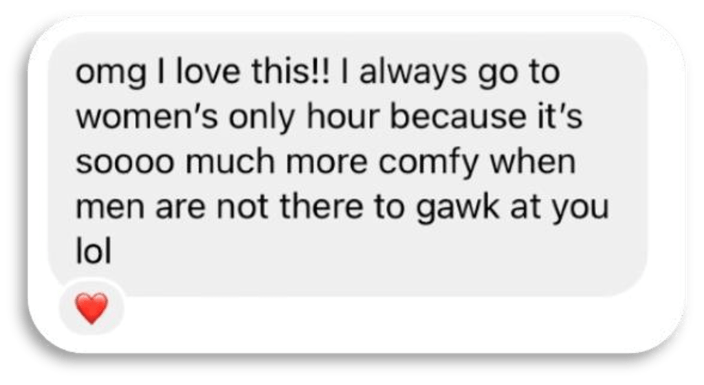 I did not receive a single response with negative experiences from men. They shared that they felt generally “safe and included” at the gyms. In contrast the majority of women shared the feeling of being “observed” and “intimidated” during regular hours. Before drawing any conclusions, I asked the same question to the women attending women-only hours when, based on the policies, there are only women and women-identifying individuals are present in the space: