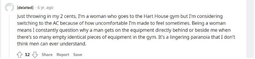 Interestingly, from more than 50 survey responses that I received and from what I found on U of T Reddit from women sharing their experiences being in the same gym space with men (like the one that you see in Figure 3), most women share variations of the same idea about the “eyes watching”. This idea implies the feeling of being constantly observed. However, it is not just about the fact that people, while being in the same space, will very likely glance at other people at some point. Instead, the idea of the “eyes watching” points to the so-called “male gaze” that not only reflects the intentionality of the act of directing the eyes towards a particular person, but also signifies the hierarchical status of the one who is watching and the one who is being watched (Mulvey, 1975) To elaborate on this, based on Mulvey’s initial theory, a male gaze implies the objectification of a woman by contextualizing her as a sexual object from the perspective of a heterosexual man (1975). Since the gym space has an ultimate focus on the body and bodily movements, it can easily become sexualized, based on the context in which one can put it. Thus, in most of the responses, there was a clear sign of women worrying about being sexualized in the space. Evidence for this is found in the urge to cover the body more during regular hours, when the space is predominately occupied by men, compared to women-only hours. What women wear is determined by the tolerance of surrounding people, not by what women feel comfortable wearing. As Schroeder argued, drawing from Mulvey’s theory, the male gaze signifies “a psychological relationship of power, in which the gazer is superior to the object of the gaze” (1998). We see the reflection of this idea in the gym setting. The underrepresentation and low statistics of women attending sports facilities, noted by university authorities, is the result of an environment where the male gaze serves as a tool for the creation and reproduction of unequal power relations among different genders.