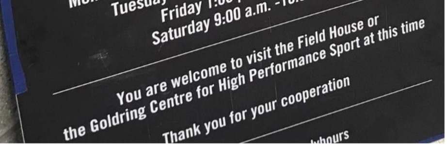During women-only hours, based on the regulations, all staff in the room should be females, access to the room is provided only to women and women-identifying individuals, and the windows on the entrance doors to the Sports and Conditioning room are covered with a special stop-sign. Let’s take a closer look at it. The sign serves as a guardian that protects roomusers from unnecessary gazes. However, who does the sign address? The large red circle with the word “stop” in the center of the poster with a black background grabs our attention. The note “women-only hours are on now” is followed by the schedule of women-only hours, and then, the author of the banner continues: “You are welcome to visit [other gym rooms inside the facility]. Thank you for your cooperation”. Who is the “you” hailed by the poster? The university’s purpose with women-only hours is to create a safe environment for the “underrepresented” group, but this “you” is not for women; the emphasis of the sentence is again on men. Instead of highlighting the safety of the environment and welcoming women and women-identifying individuals, the poster with such an aggressive design is trying to stop the men, the dominant group at open gyms. The chosen words once again expose the ultimate power of men as a group and more importantly, whom the sports facilities are made for, functioning for, thinking of, and addressing.