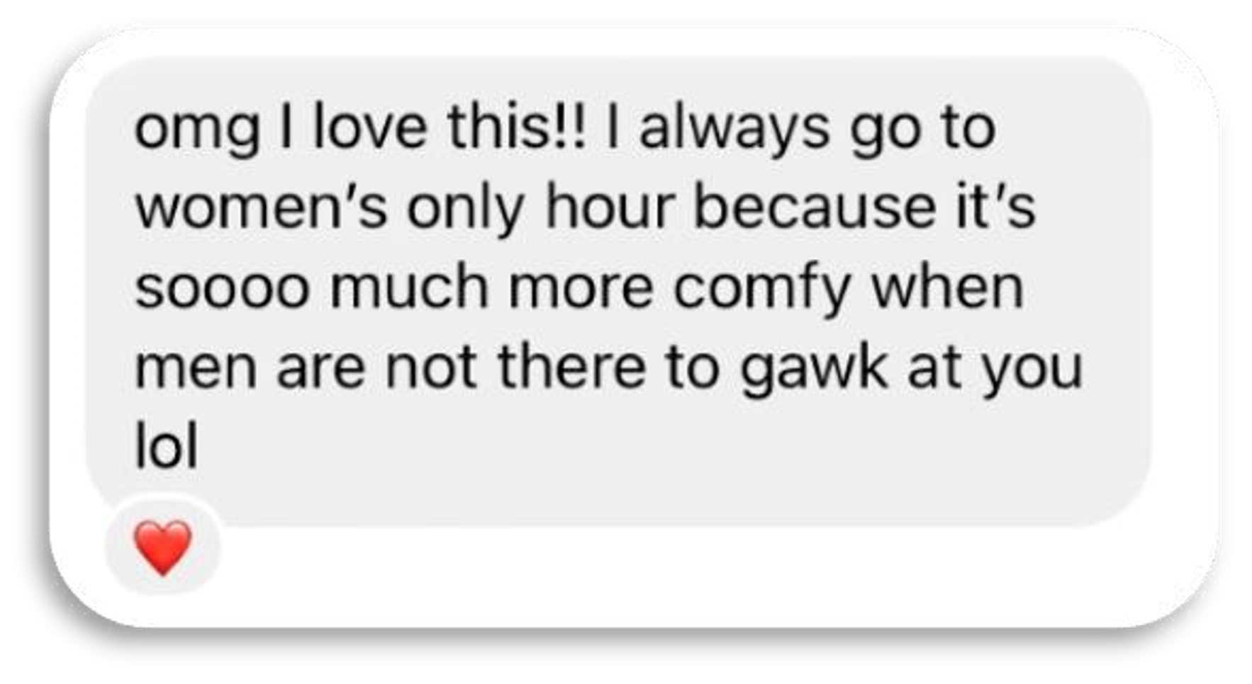I did not receive a single response with negative experiences from men. They shared that they felt generally “safe and included” at the gyms. In contrast the majority of women shared the feeling of being “observed” and “intimidated” during regular hours. Before drawing any conclusions, I asked the same question to the women attending women-only hours when, based on the policies, there are only women and women-identifying individuals are present in the space: