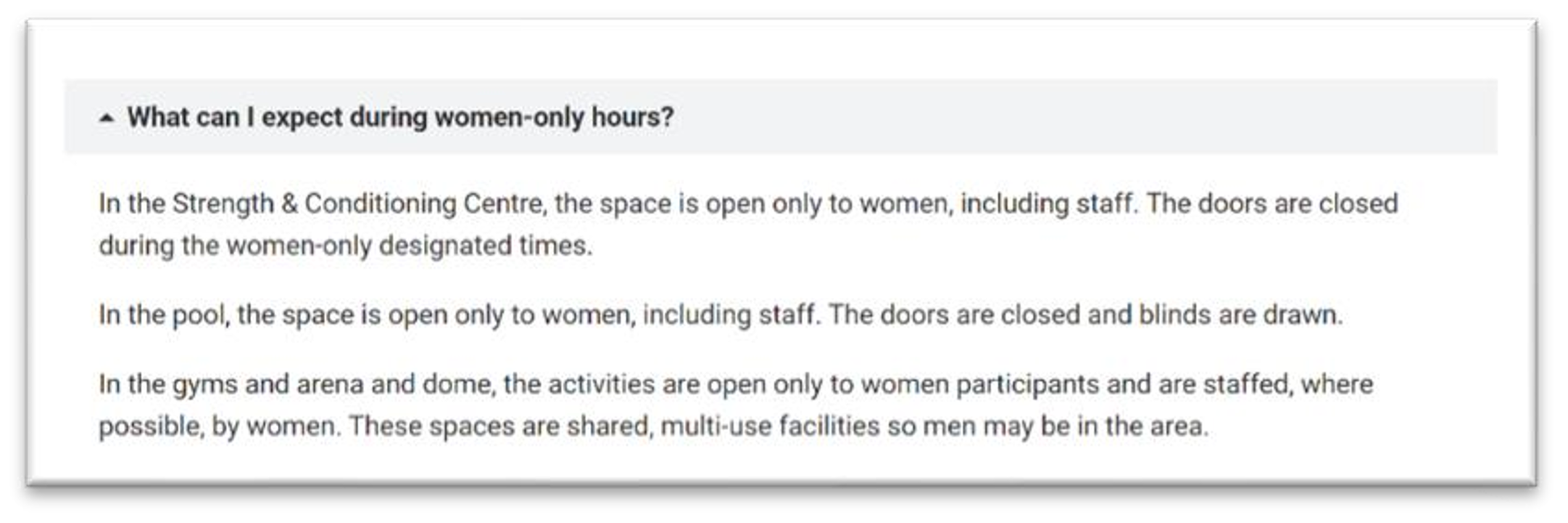 During regular hours, which are operating most of each day, there are no limitations on who can enter the room and work out. As for women-only hours, they usually occur once or twice a day for a one-hour session. Based on the information from the gym’s website, a part of which you can see in Figure 2, and the interviews with staff, only “women and women-identifying individuals” are allowed to the space during this hour. (“Women-Only Programs”).