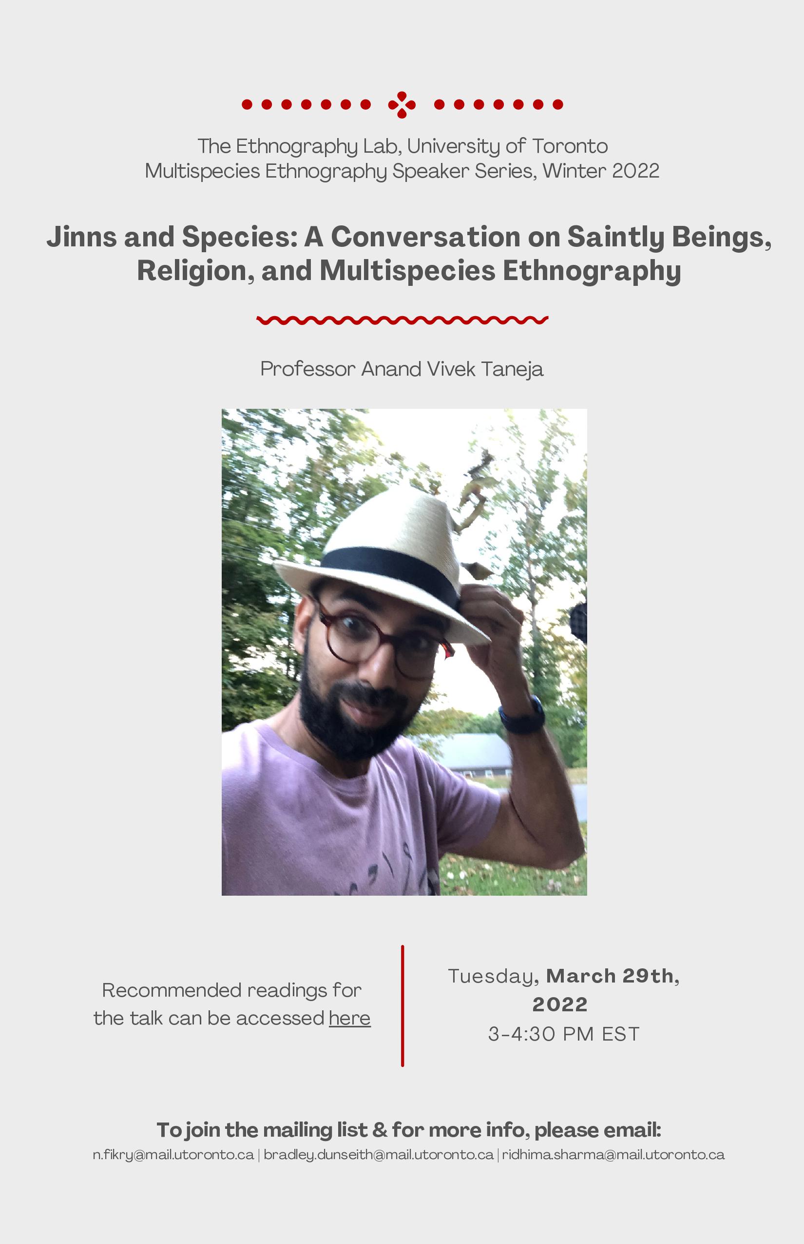 Abstract: In this conversation, Anand Taneja will share a few thoughts on his research on jinns and other spirits, beings, and species in India. We will discuss what can happen at the crossroads of religion and multispecies ethnography, both conceptually and ethnographically.