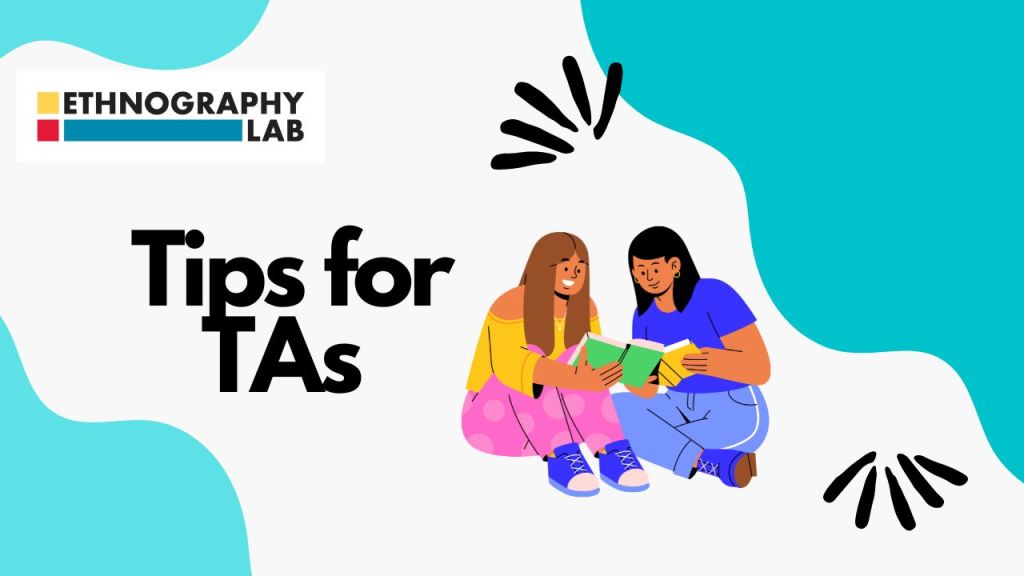 Teaching ethnography can be a challenging task, especially if you have never conducted ethnographic research yourself. As TAs, you have a major role in supporting students every step along their ethnographic journey. While many of these tips might apply equally to teaching other non-ethnographic courses, we advise you to be extra friendly, present, patient, and supportive in teaching ethnographic courses. Ethnography can be overwhelming, confusing, and lonely at first, and your inviting as TAs will make a huge difference with students. Suiting the exciting nature of ethnography, we have curated our tips in the form of a lively infographic that we hope will be helpful in your teaching experiences.