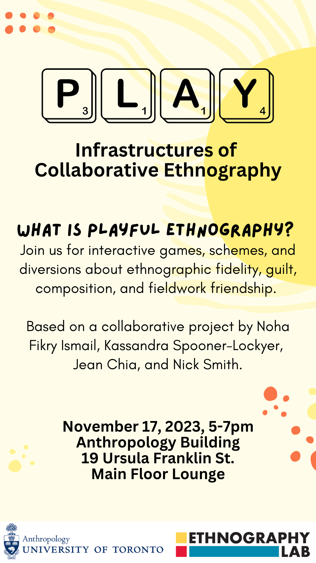 Join us for some interactive fun with games, schemes, and diversions about ethnographic fidelity, guilt, composition, and fieldwork friendship. These experiments derive from a collaborative ethnographic project on play conducted by ethnography lab members Noha Fikry Ismail, Kassandra Spooner-Lockyer, Jean Chia, and Nick Smith. The event will begin with brief introductory remarks by the researchers followed by food and drink, with all contributors on hand to discuss and play along.