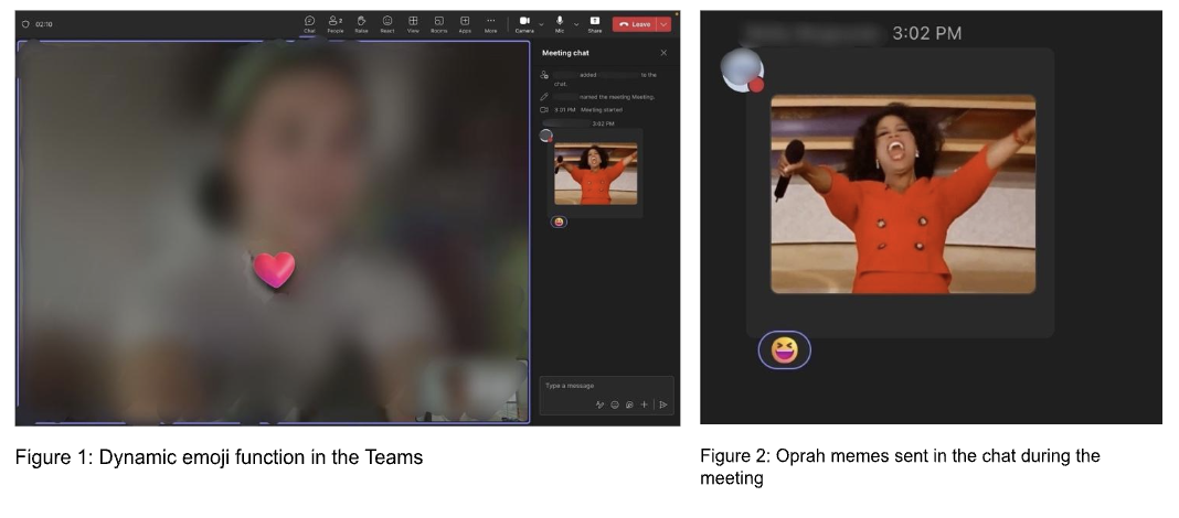 We identified an unforeseen “fieldsite” in the Teams chat and reaction features which offered virtual additions to CLSS administrative meetings. The use of reactions, such as hearts or hands-clapping, liberally accompanied the meetings. We took note of the use of gifs in the chat box, an enhanced visual language. We did not have to infer the emotions and sentiments of meeting participants based only on body language and facial expressions, they were magnified and materialized on our screens.